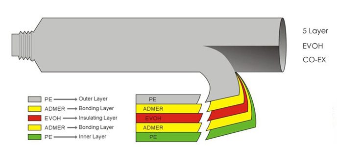 Los tubos cosméticos de 5 capas (tubos EVOH/tubos CO-EX) son con EVOH. La siguiente imagen muestra la estructura del tubo de 5 capas.